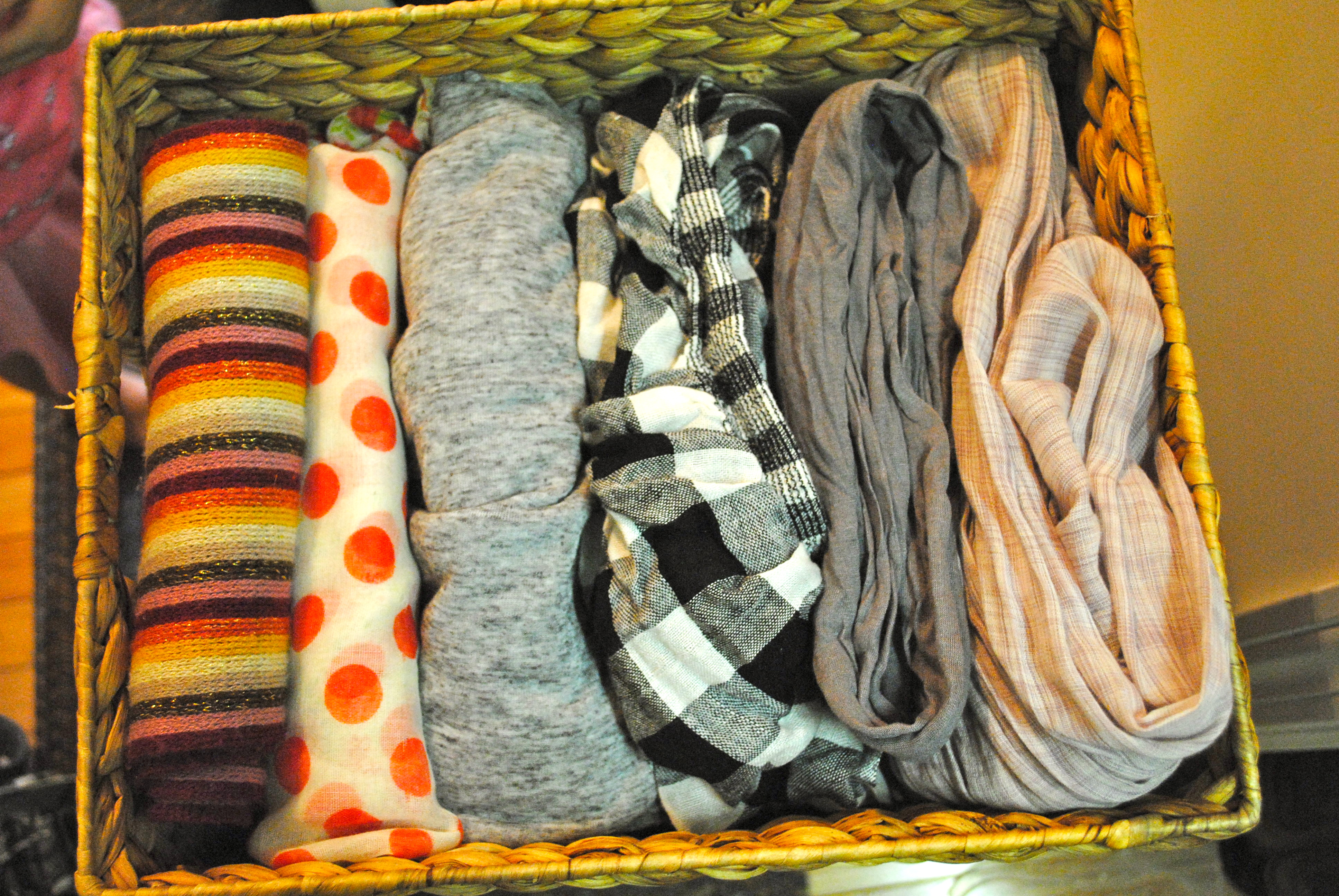 My pretty scarves have a home. A little OCD maybe but I don’t care. This is my blog and I can put up whatever I want 🙂 A pretty basket of organized scarves makes me happy.