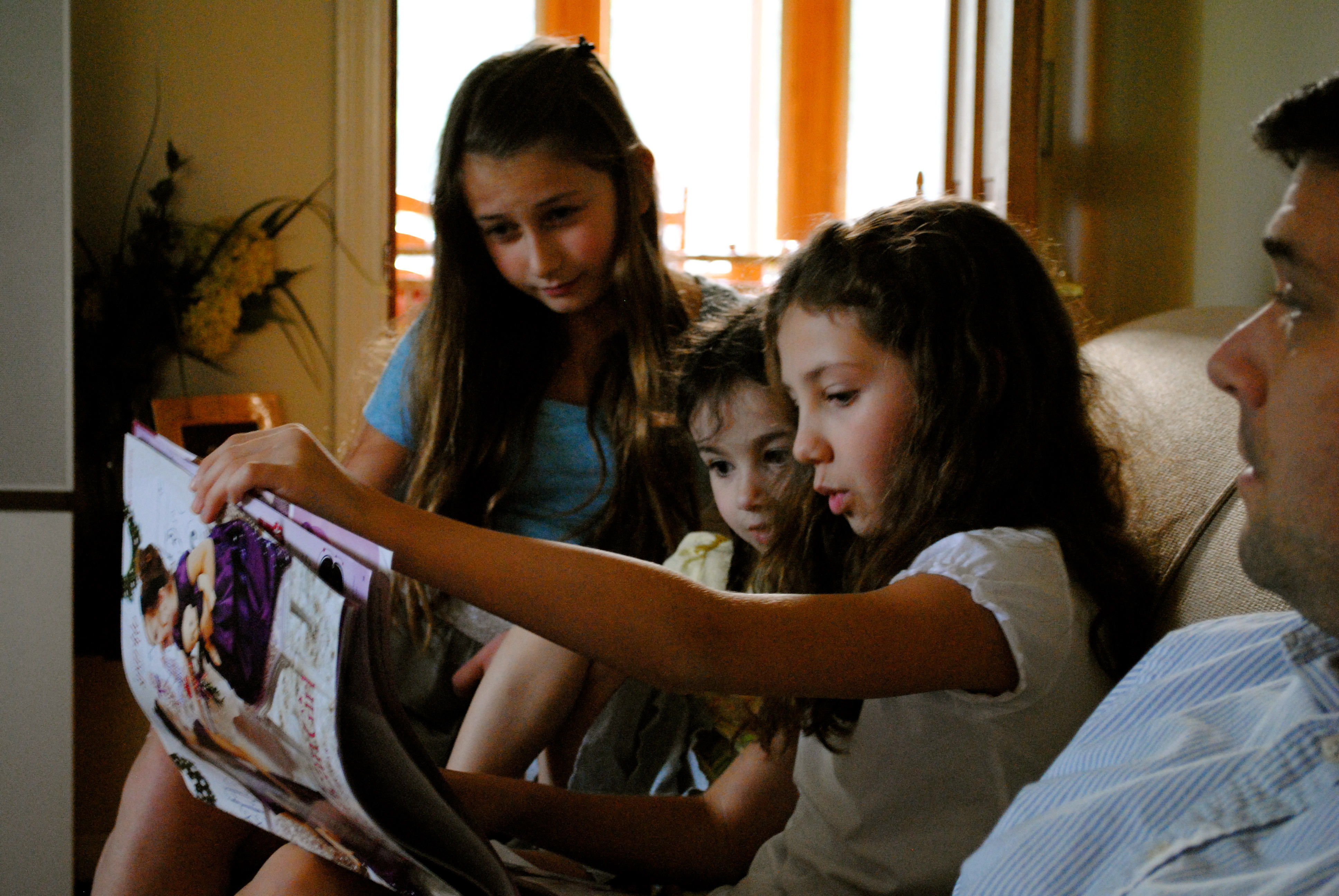 Megan and Chloe are showing Lucy the wonderful world of the American Girl catalog.
