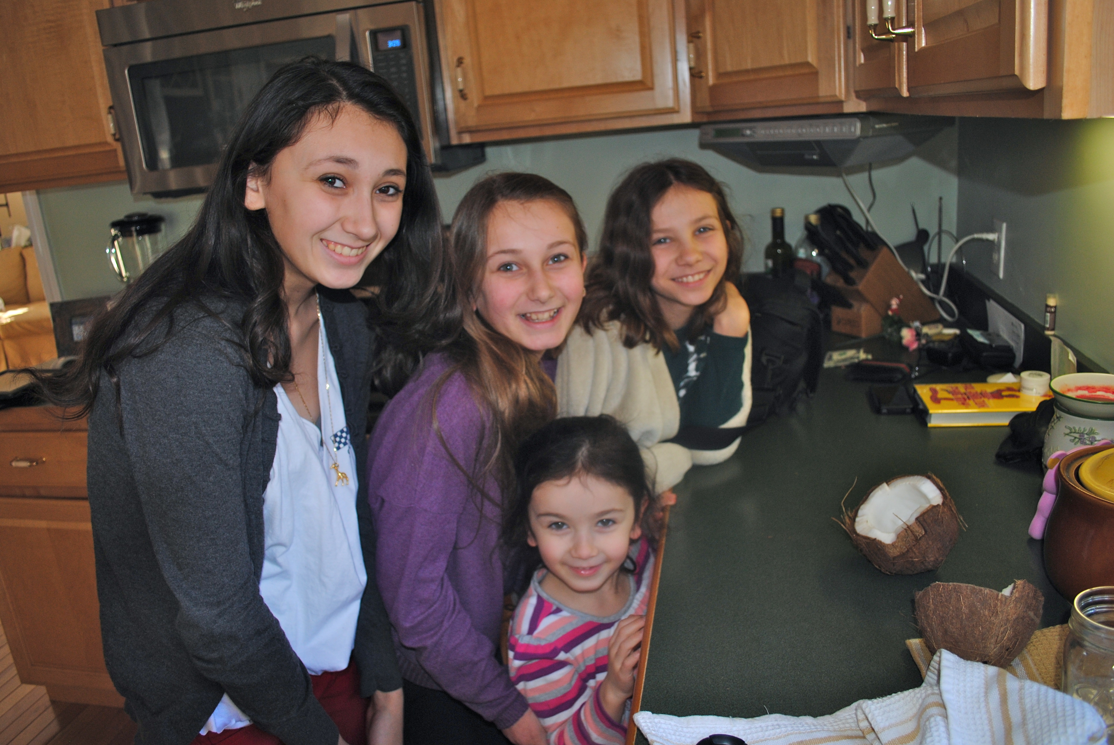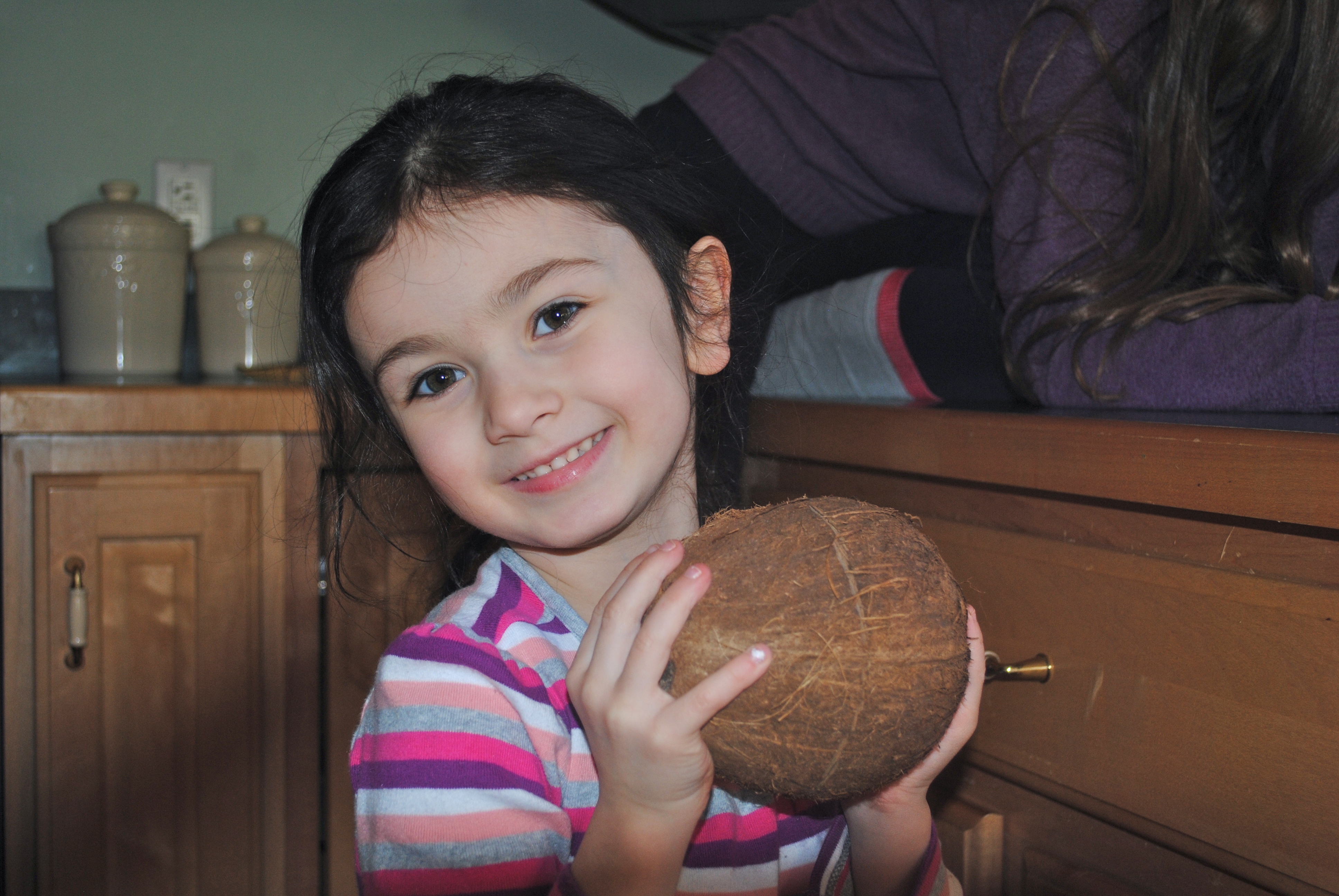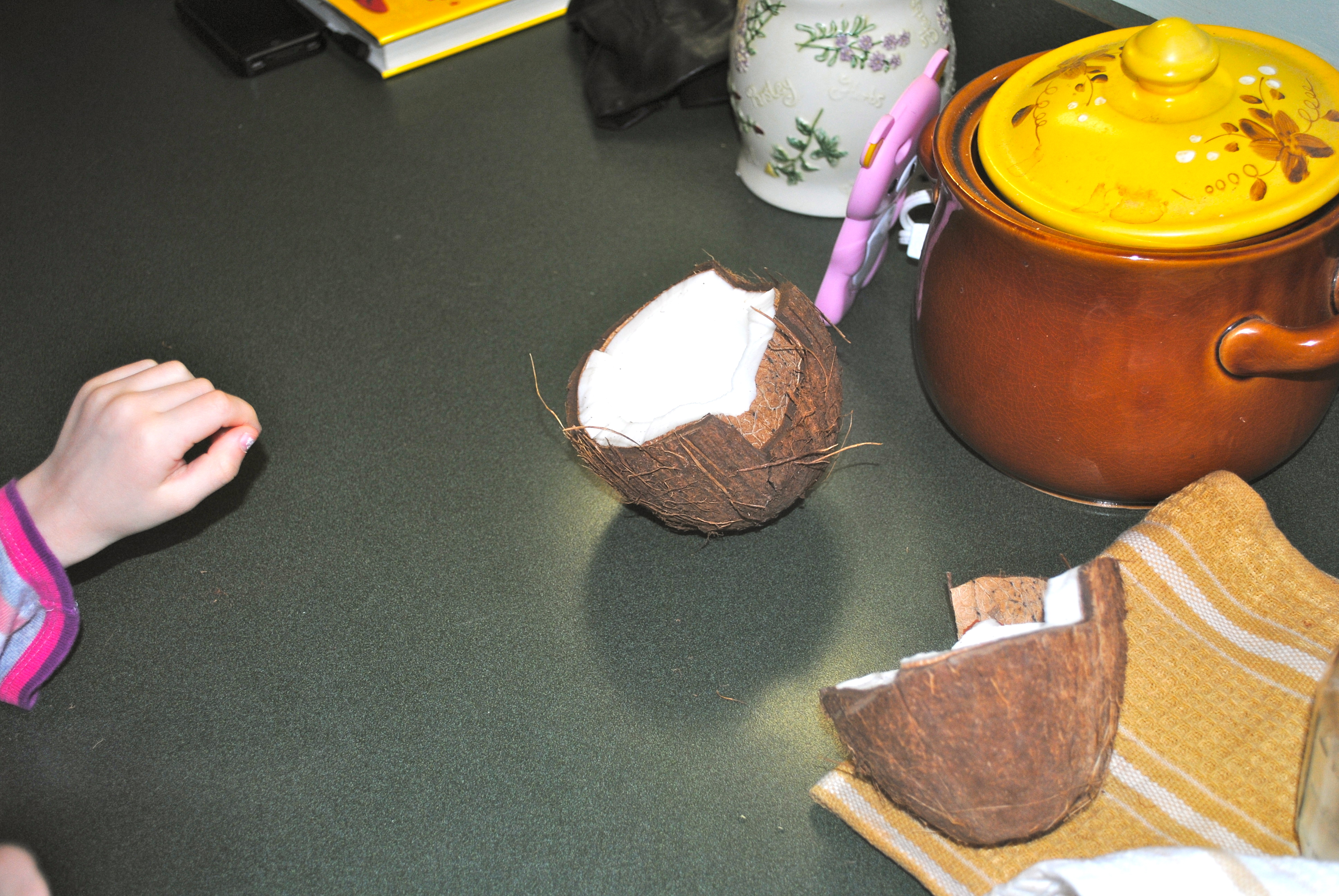My children have a strange fascination with coconuts. We went to Trader Joe’s this morning and Chloe had to have a bag of Coconut Chips. They are delish!! Emma got to thinking about regular coconuts and how much fun we all have when we buy one. Strange, huh?