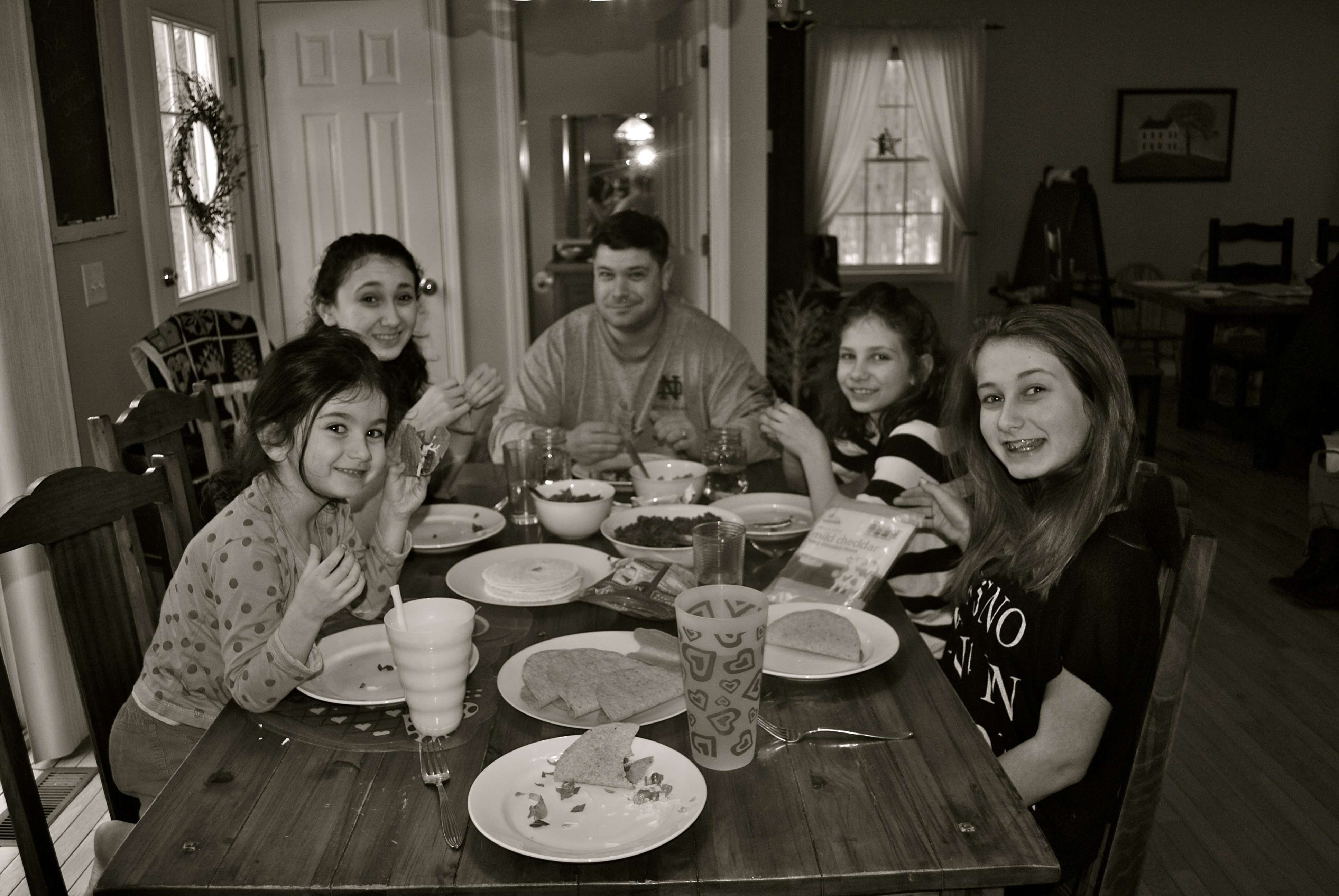 Sitting down to dinner with my whole family is one of my favorite things! Jon has been coming home early every night this year and it’s been great! The other night while eating dinner I ran to get my camera. Everyone smiled because they know that I don’t have a problem taking a picture of them with their mouths full. Megan laughed and said “you’re a weird mom.” I explained to her how she will love to look back and see us all sitting around the table together. I would LOVE to see a picture of my brothers and I sitting around the dinner table. So here’s a picture of “Taco Monday”