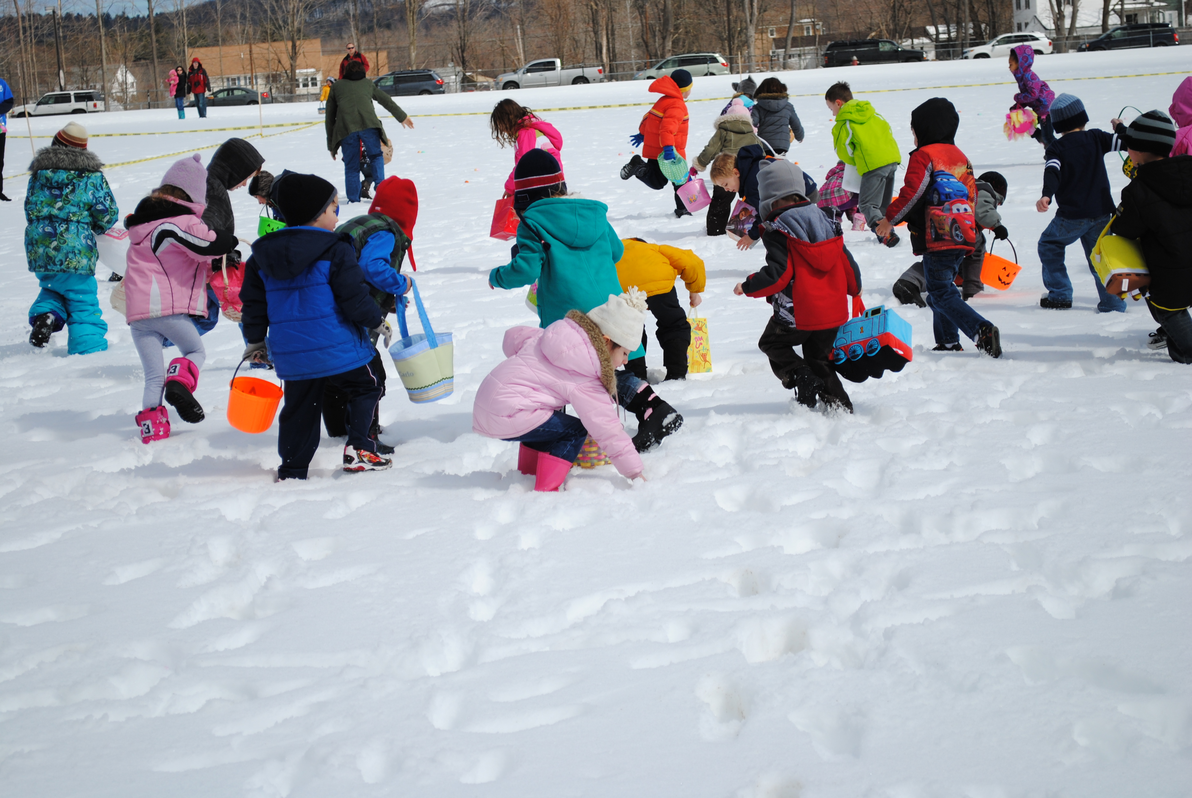 Sunday was the town Easter egg hunt. In the snow with hundreds of kids and not enough eggs. Lucy had to run with the big kids this year and was really disappointed to only get 5 eggs. We thought she did such a great job though!