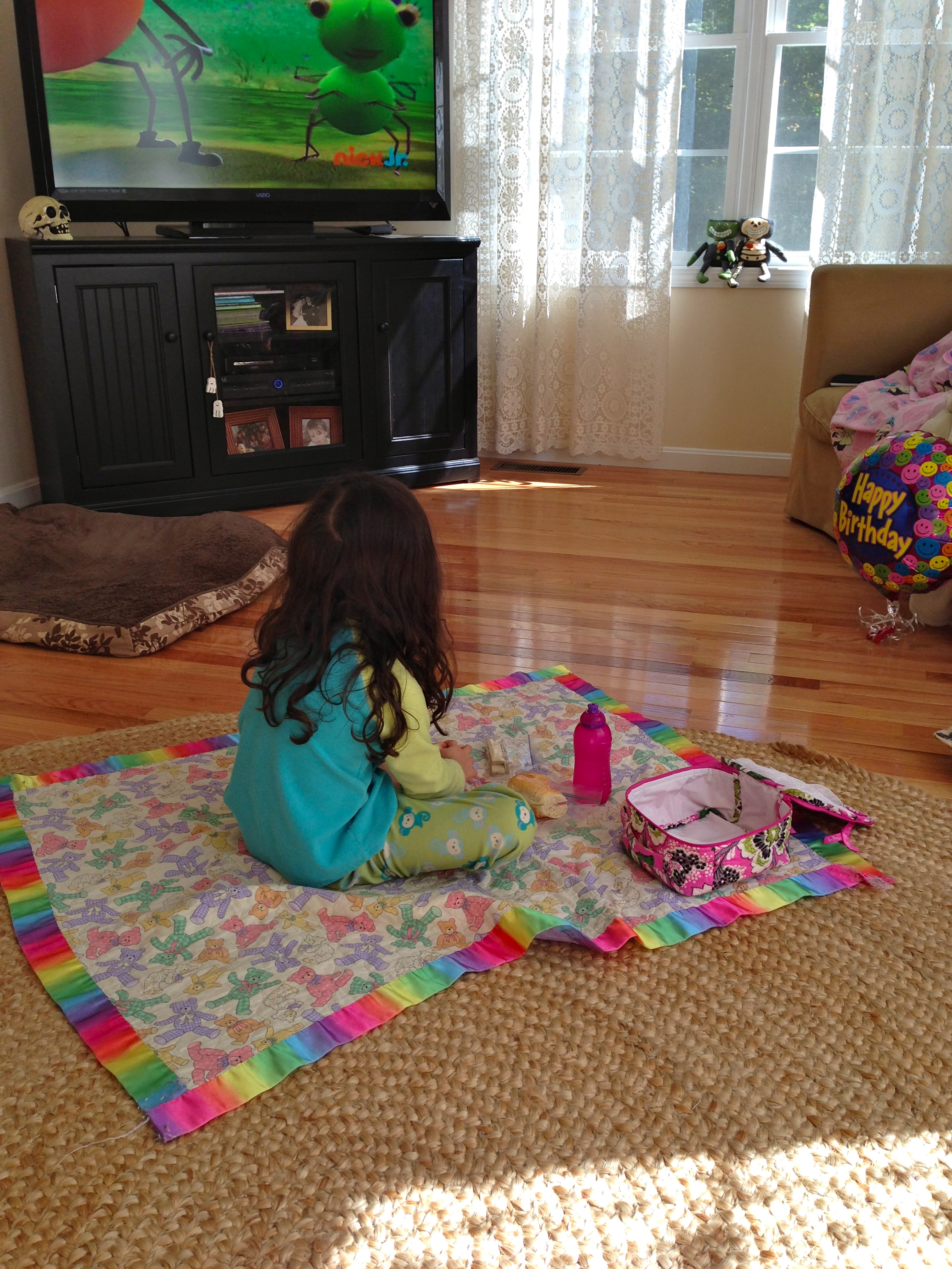 Her lunch box was already packed when we made the decision to stay home so here she is having a picnic today.