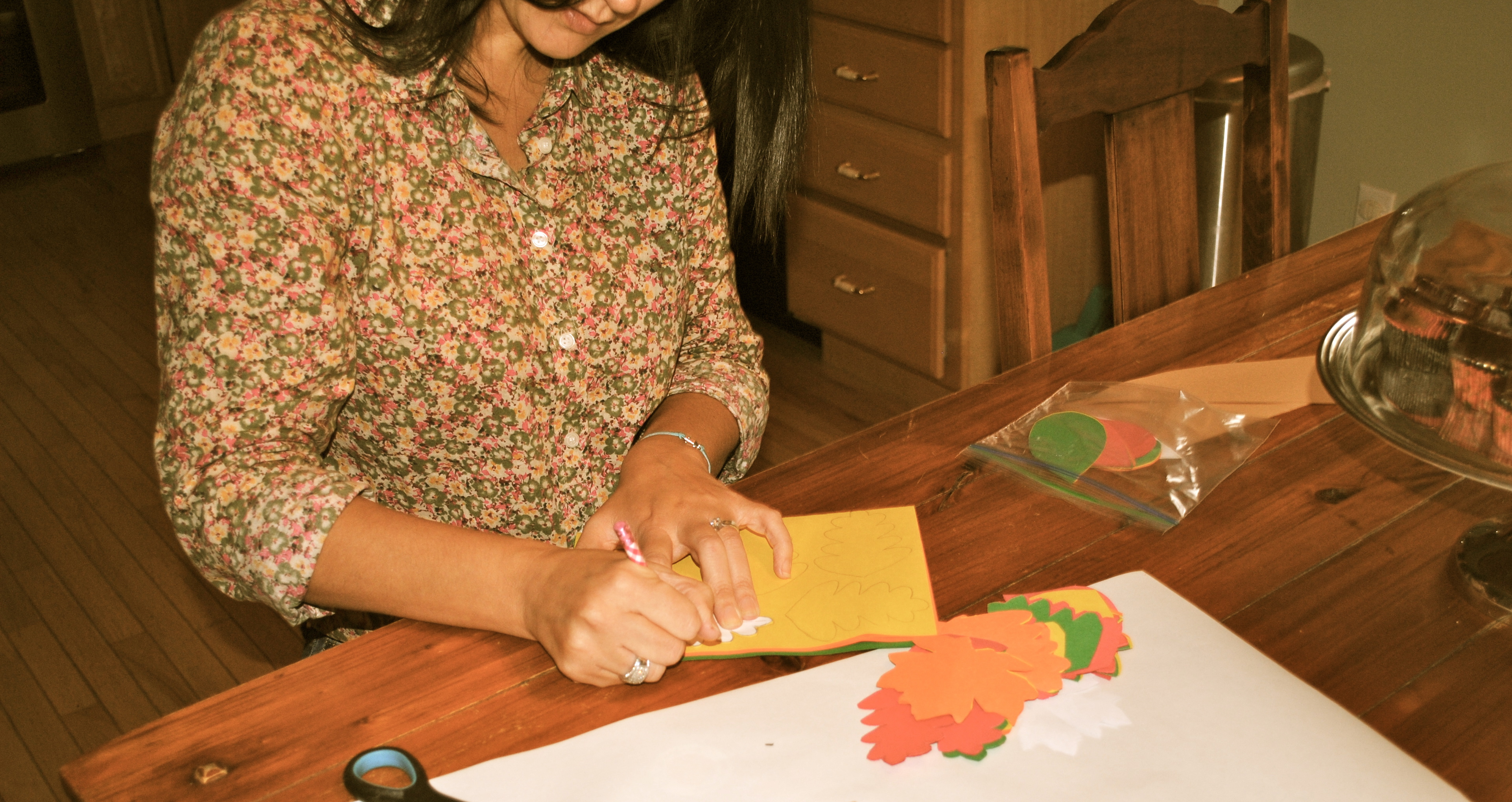 I made it through September and October without feeling lonely. I walked in from the bus stop on November 1st and the quiet in the house hit me like a ton of bricks. I’m not sure if it’s because the holidays are coming and there isn’t anyone in the other room watching holiday cartoons or coloring holiday pictures, or the fact that Jon has been traveling for work since August. I spent about a half an hour feeling sorry for myself. I didn’t have any longer then that to sit and pout. I had things to do. I cleaned up my Halloween decorations, put out the thanksgiving ones. I met Lucy for lunch, ran some errands and came home to clean. Nothing exciting, just a typical Friday for me. As I looked around the house I realized that there are so many things for all of us to be thankful for. Last November we did our thankful poster but this year I took an idea from a mommy blogger and decided to do the thankful tree. I sat there cutting out over 100 leaves and realized that it was time to get Emma. When she came home she made the trunk of the tree. It was nice sitting there doing a project together.