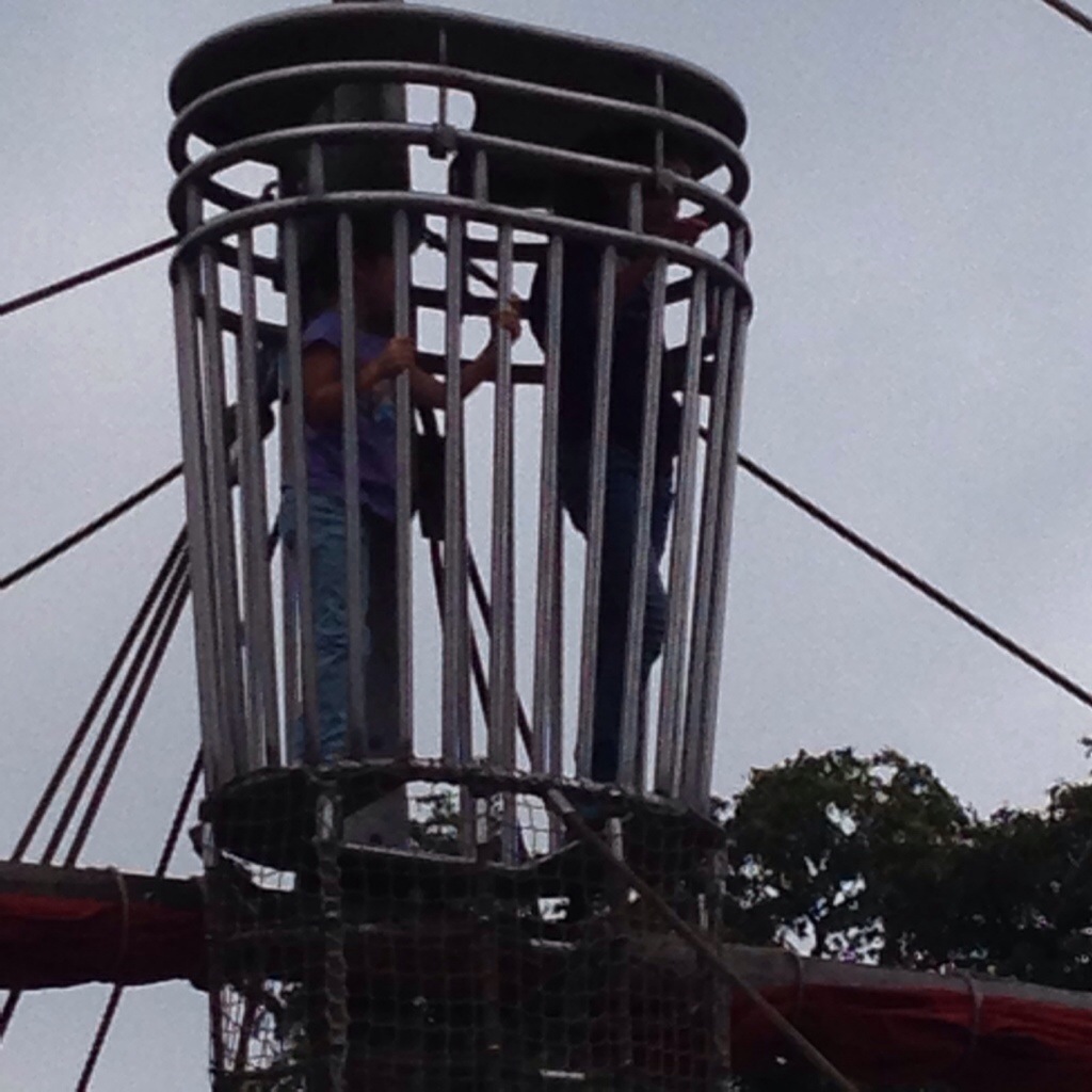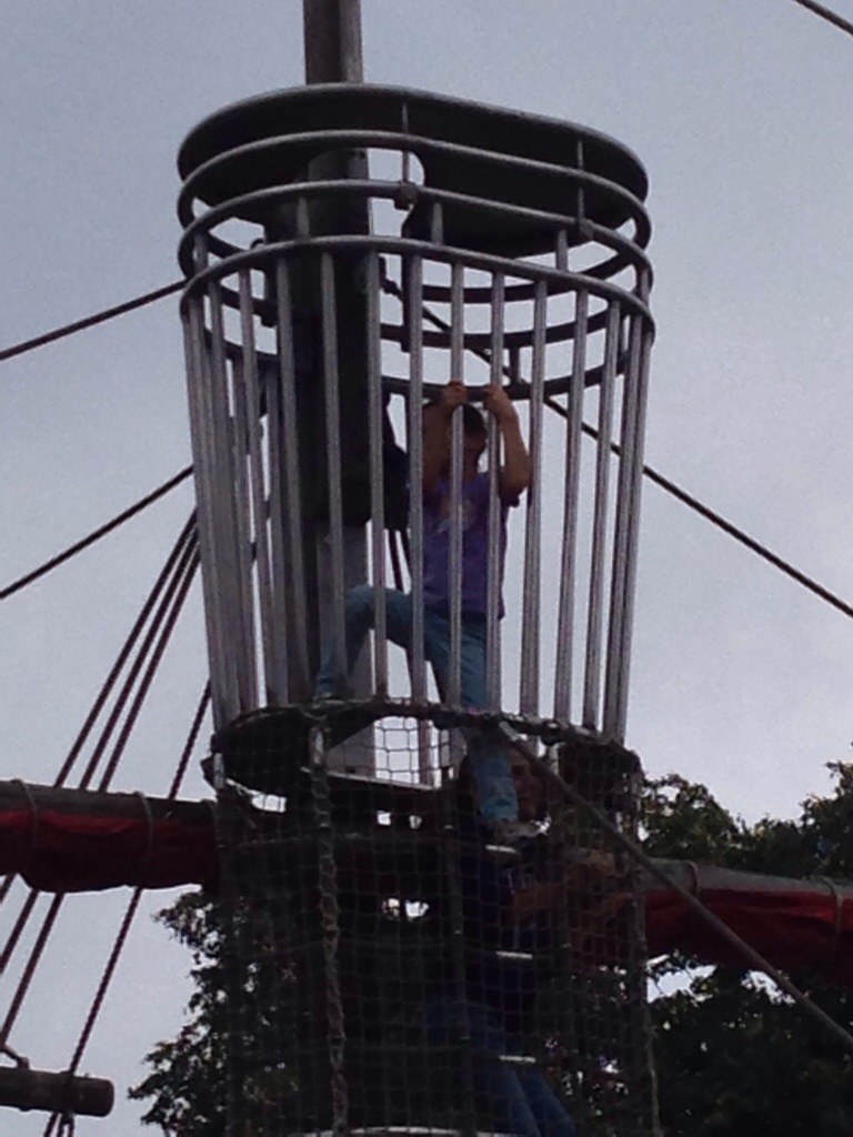 Do you see the crows nest at the top of the Pirate ship? Yeah, Lucy and Chloe climbed to the top. Now I understand why most parents sit and look at their phones at the park instead of watching their kids take risks.