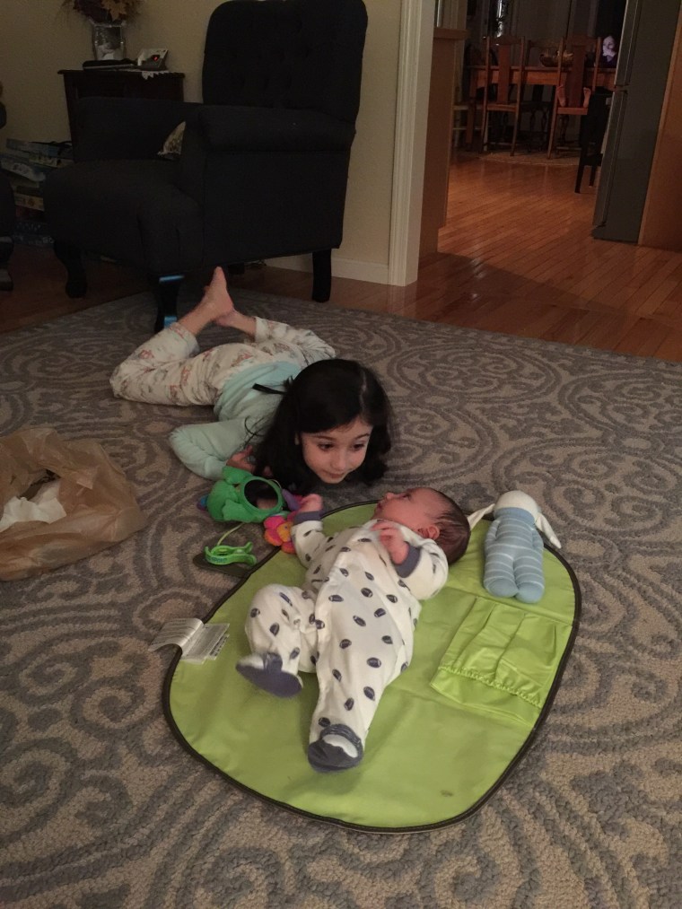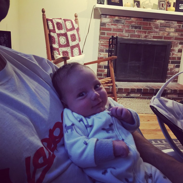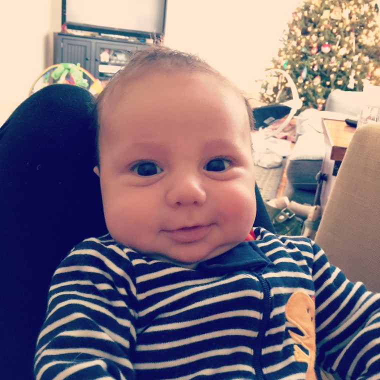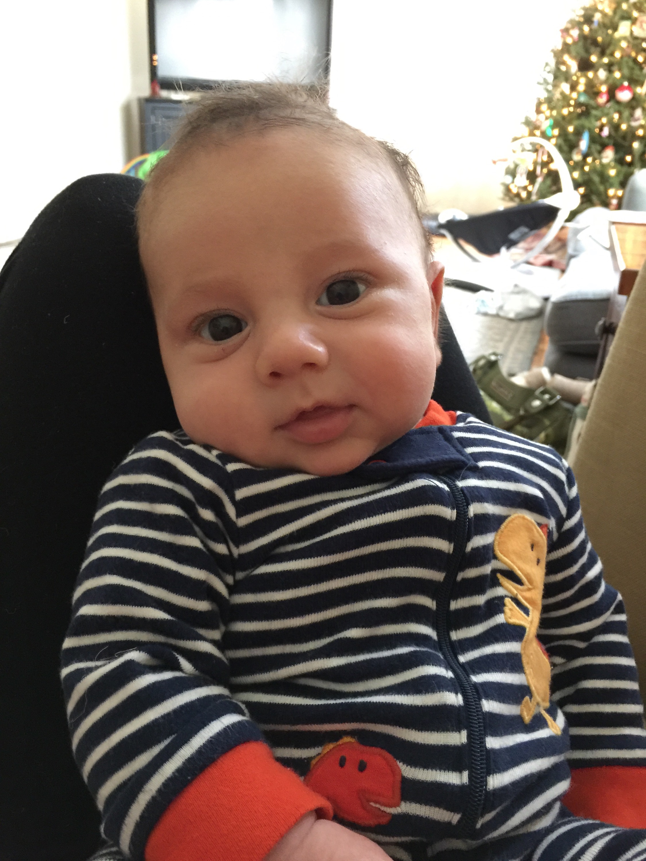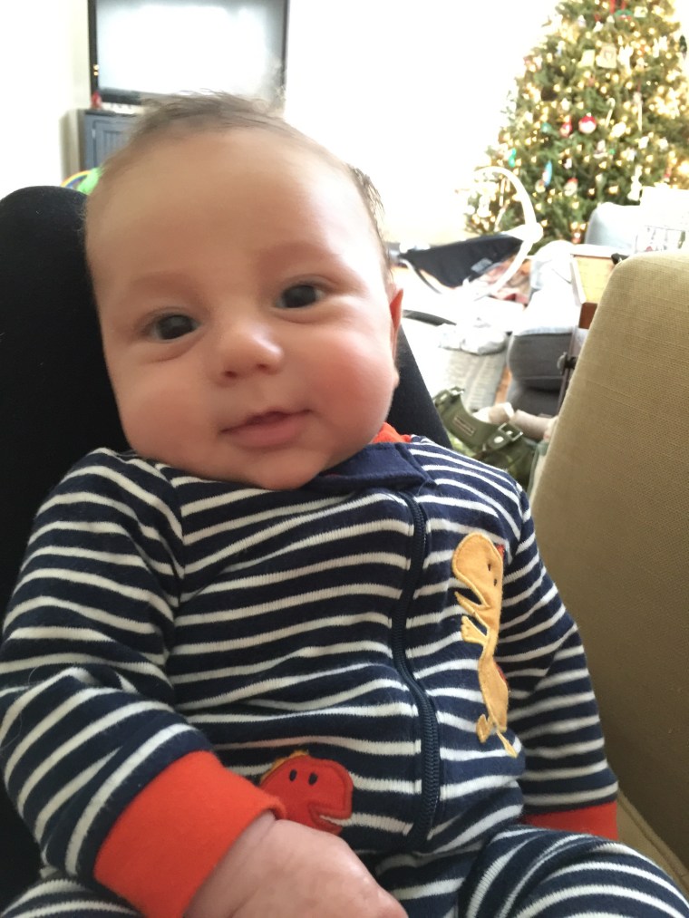 Loves: to be held!! This baby wants to be held nonstop! There is always someone willing to grab him so he’s pretty lucky! He also likes to lay on his playmat and “play” with his toys. He’s been busy staring at the lights on the Christmas tree this week and likes to stare at the ceiling fan 🙂