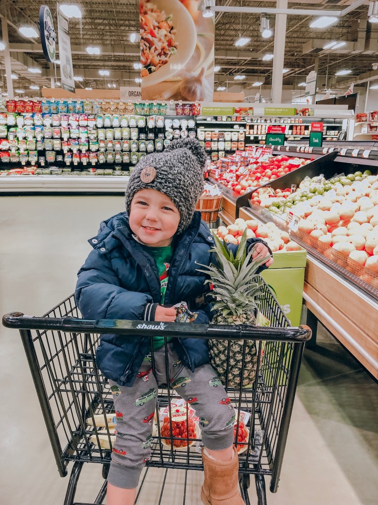 I had this cute little shopping buddy with me. We went out every single day in December. There he is shopping in his pajamas two mornings before Christmas.