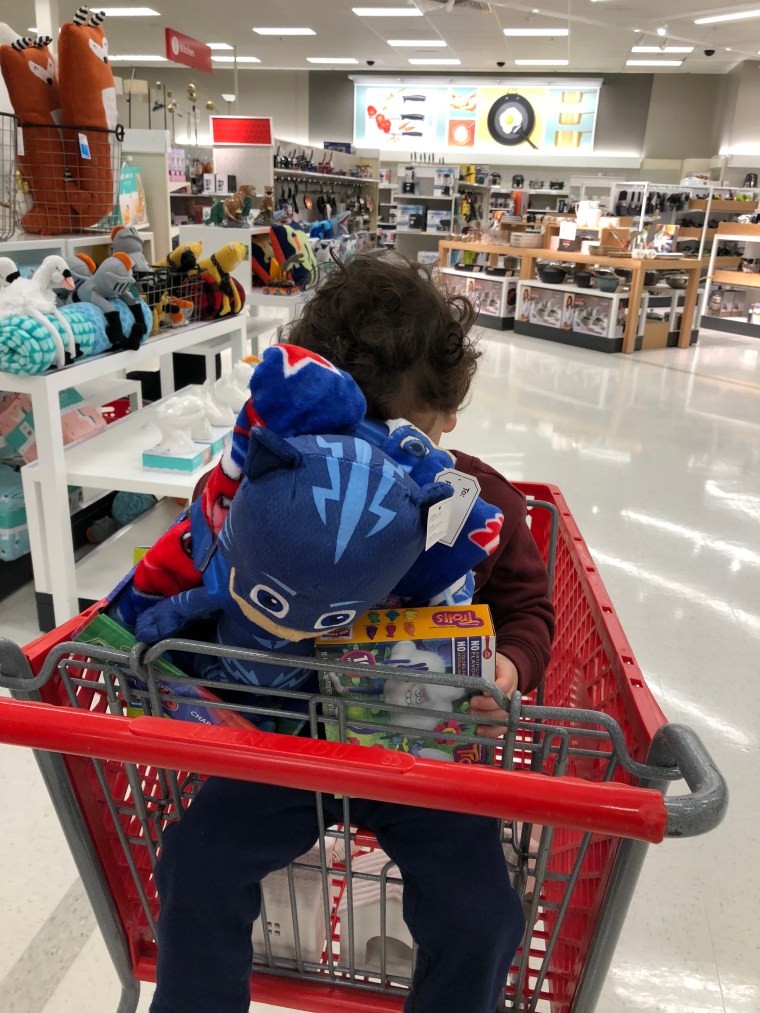 I had this cute little shopping buddy with me. We went out every single day in December. There he is shopping in his pajamas two mornings before Christmas.